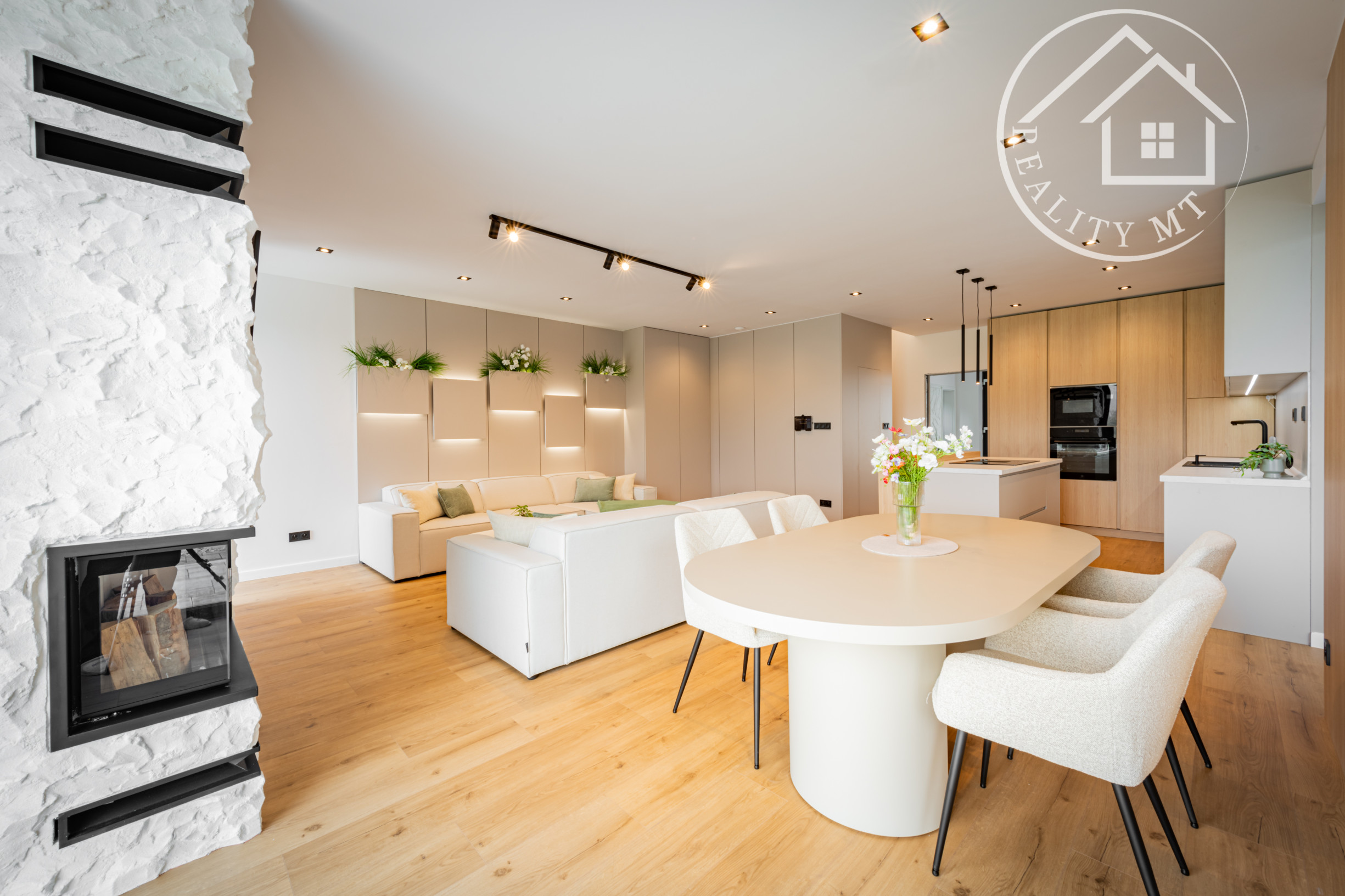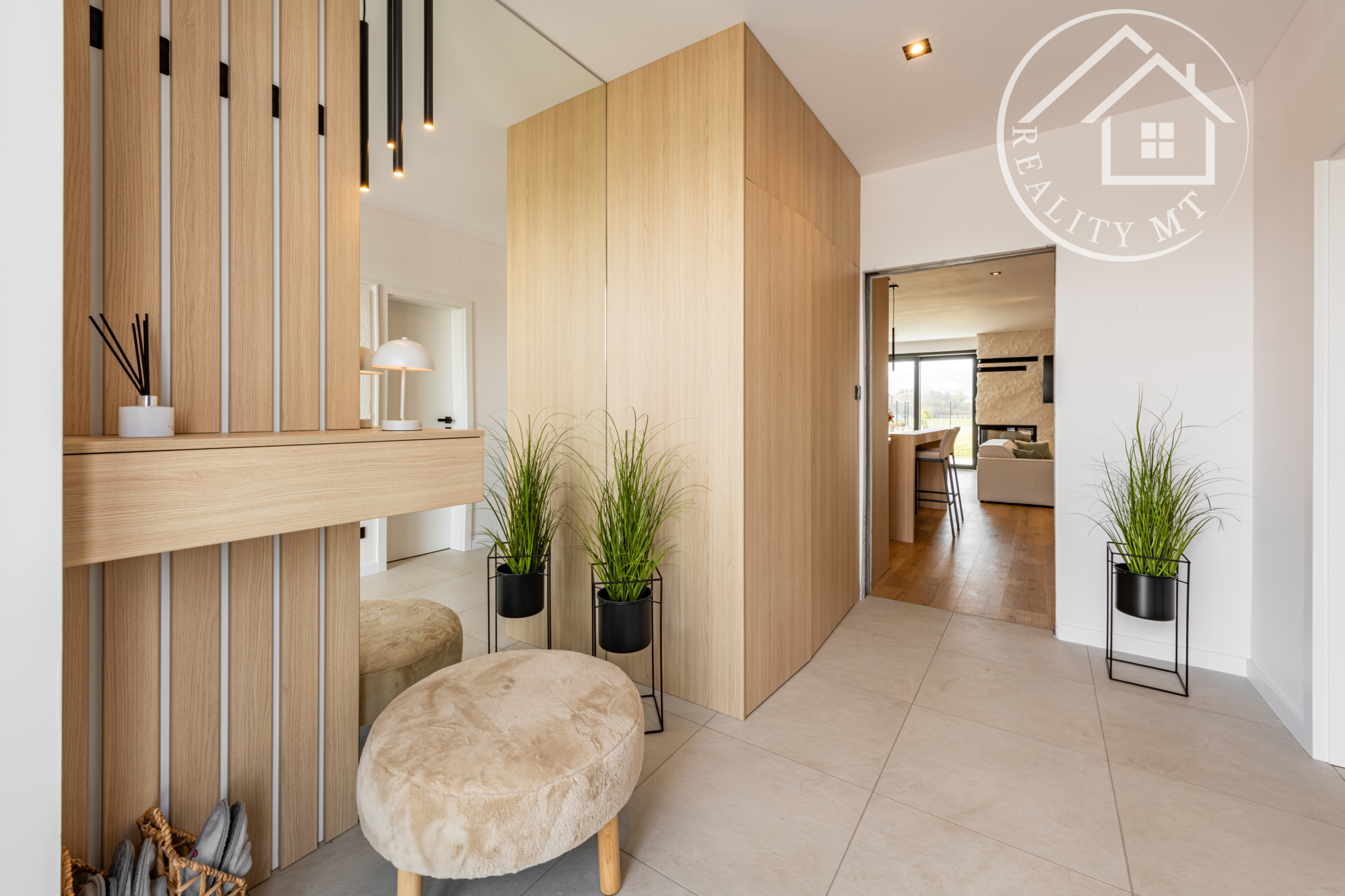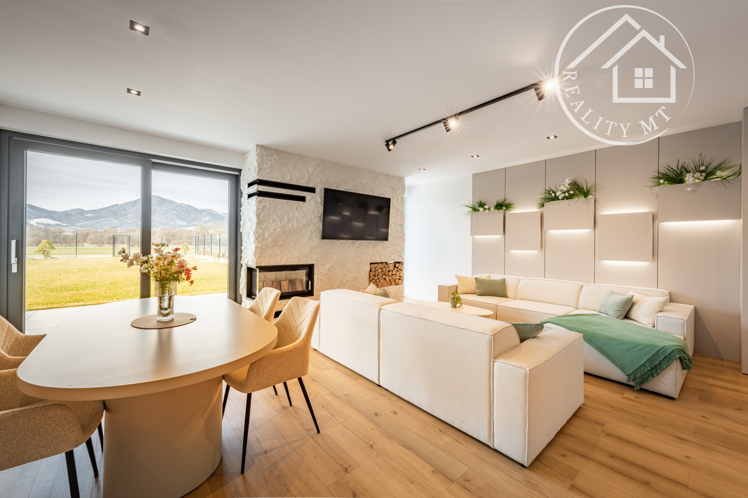 Interiér domov je navrhnutý s dôrazom na komfort a funkčnosť. Dominantou je otvorený spoločenský priestor s krbom, ktorý prepája obývaciu izbu, jedáleň a kuchyňu. Z tohto priestoru je zároveň priamy vstup na vonkajšiu terasu, ideálnu na oddych aj rodinné stretnutia.