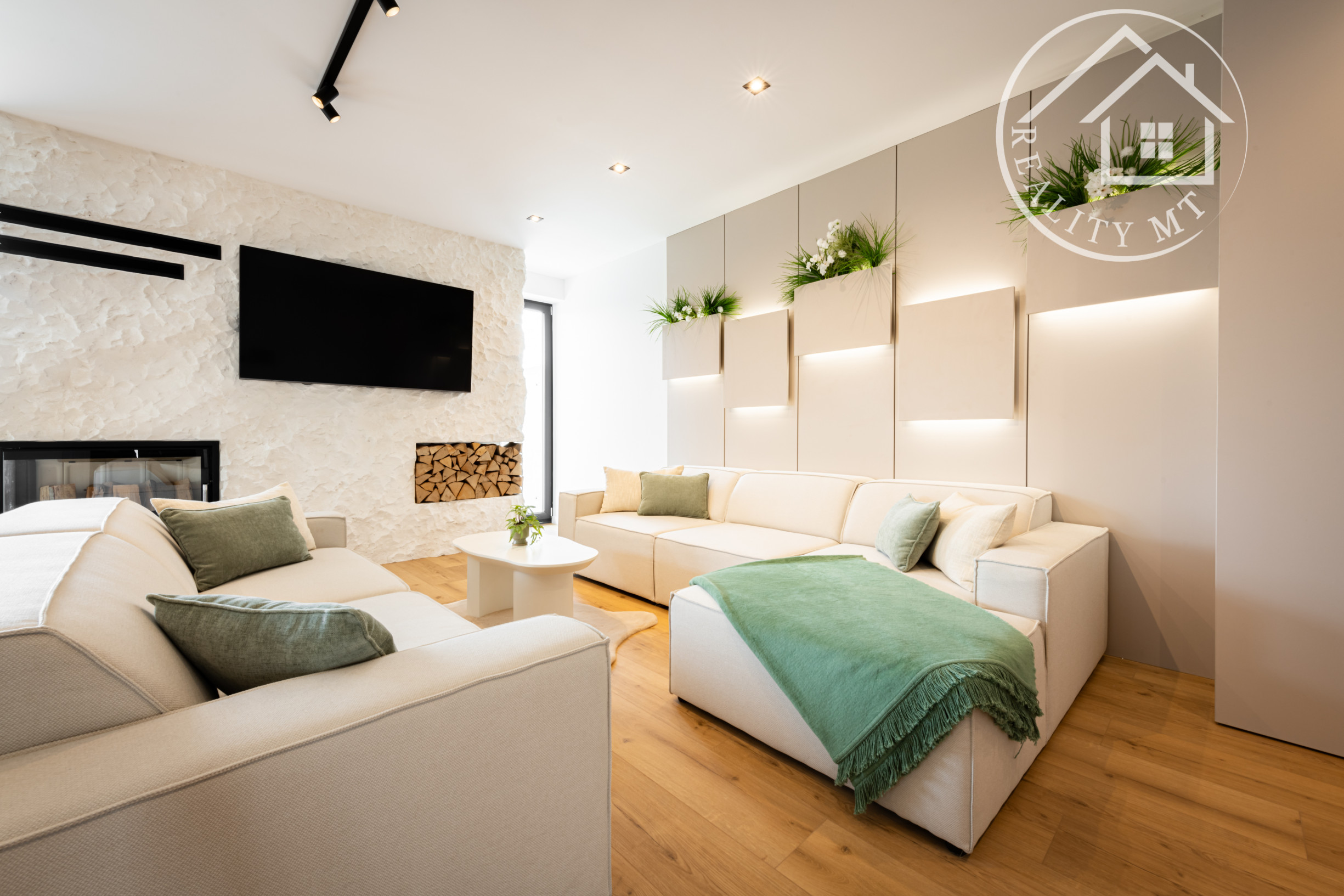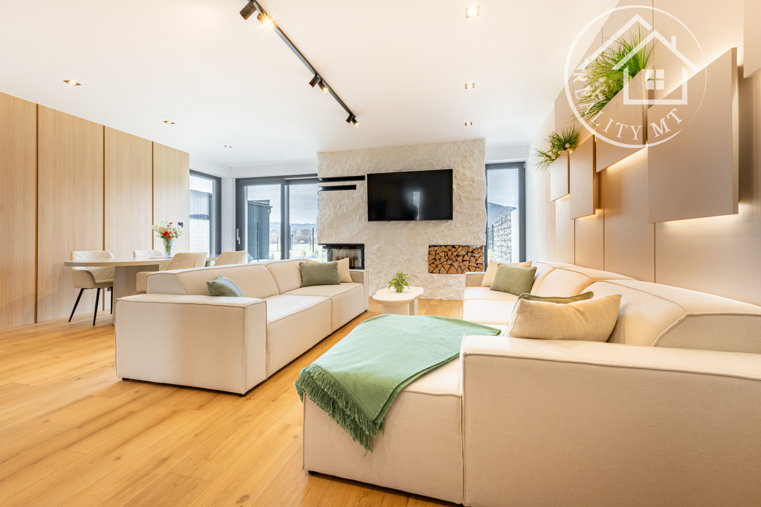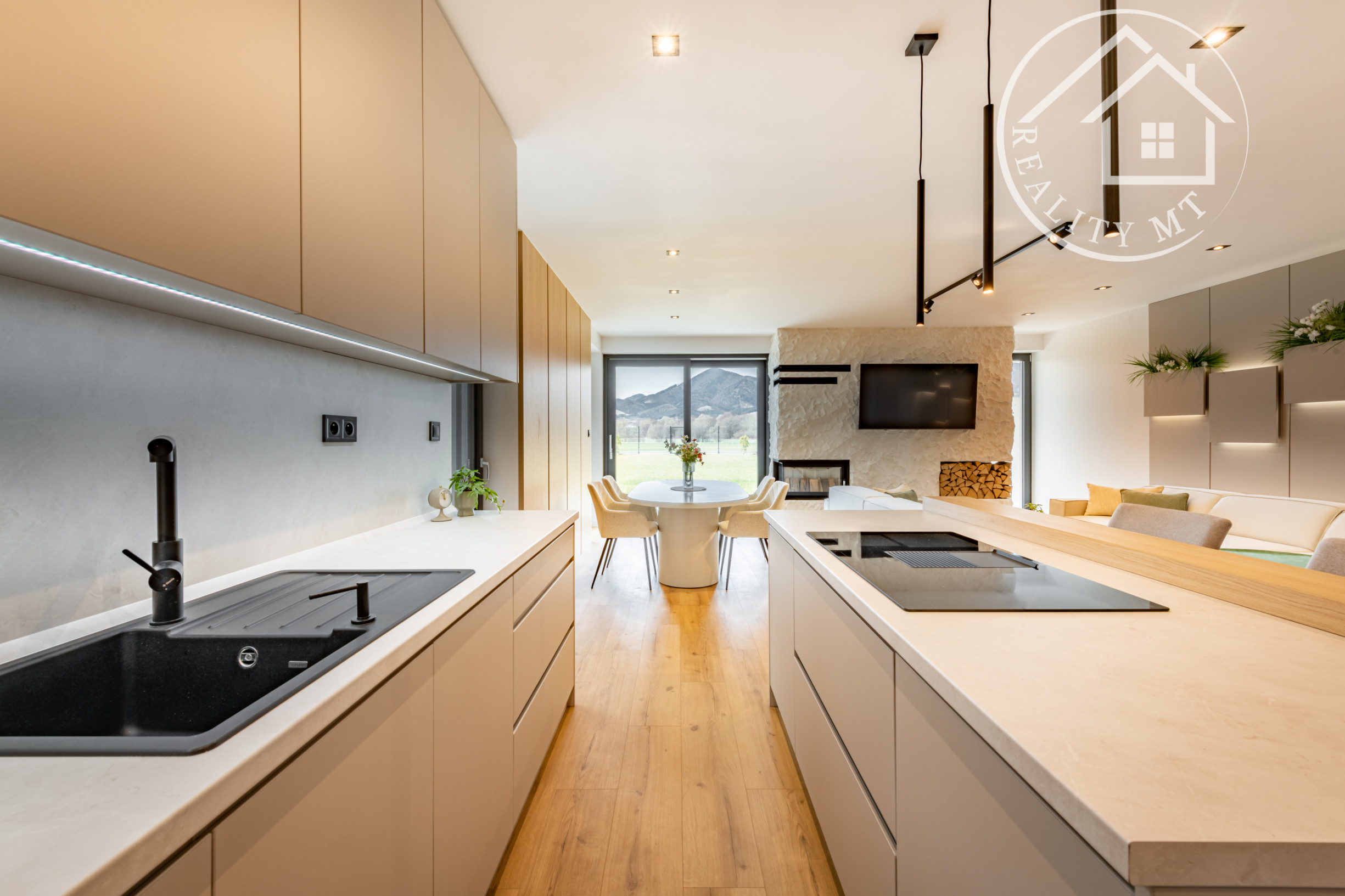 Interiér domov je navrhnutý s dôrazom na komfort a funkčnosť. Dominantou je otvorený spoločenský priestor s krbom, ktorý prepája obývaciu izbu, jedáleň a kuchyňu. Z tohto priestoru je zároveň priamy vstup na vonkajšiu terasu, ideálnu na oddych aj rodinné stretnutia.